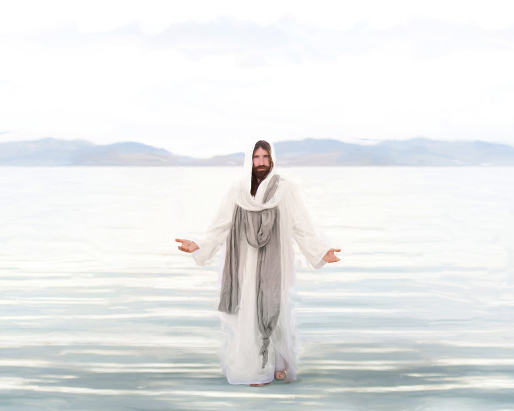 Resurrected Jesus Christ walking on water with arms outstretched.