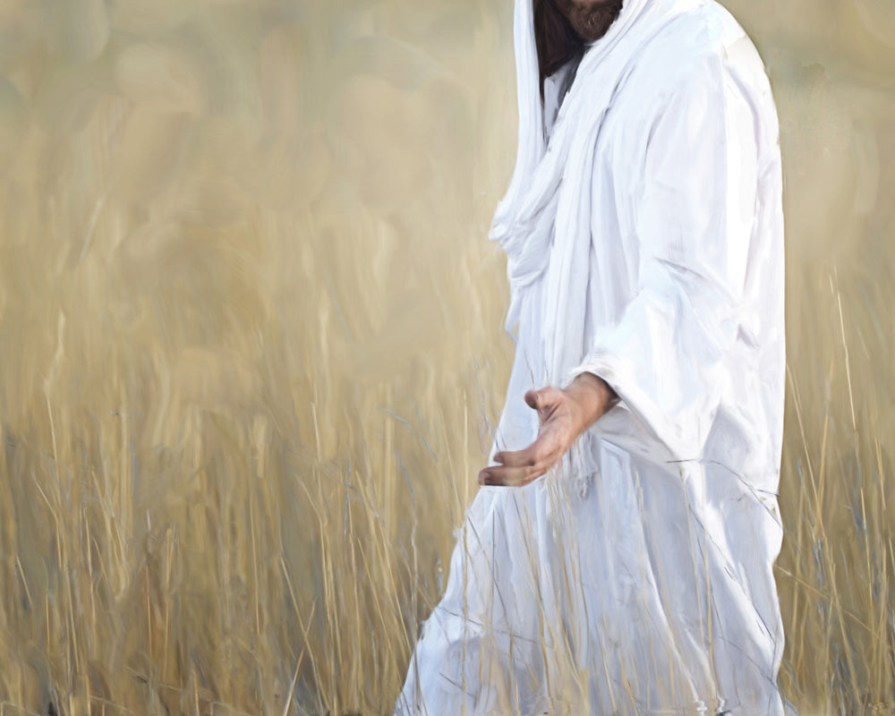 Jesus walking through a wheat field. Only his robe and outstretched hand is visible.