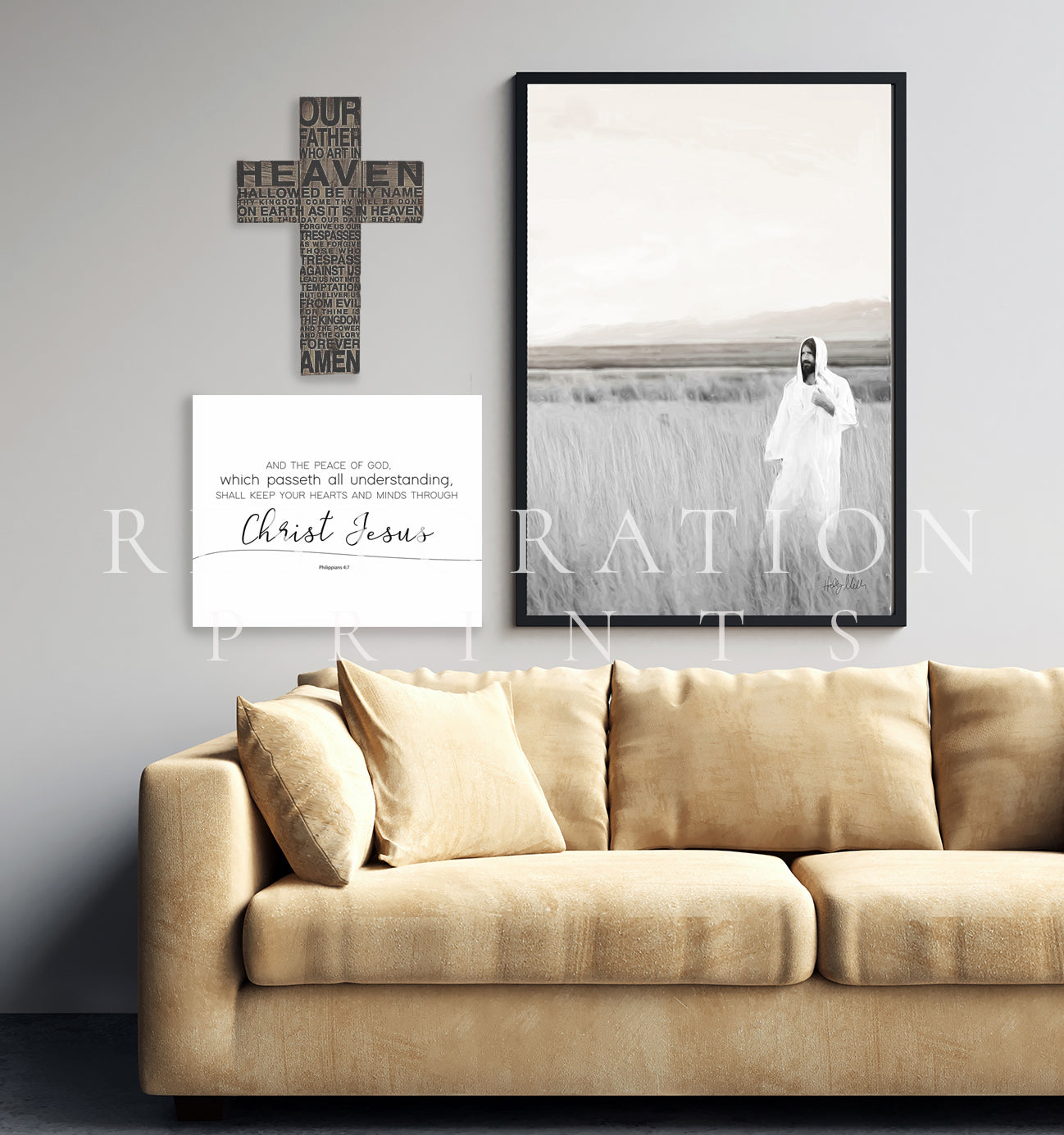 The frames and furniture you see in the images are renderings, which means they are just digital props to help display my art. I recommend looking at Hobby Lobby as I've had a good experience with them and their prices are reasonable. They can also help you with other ways to display your prints (such as dry mounting on foamcore).